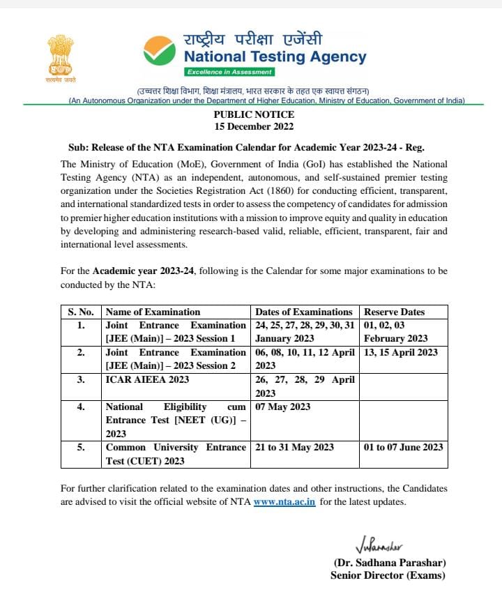 NTA released calendar for major exam dates